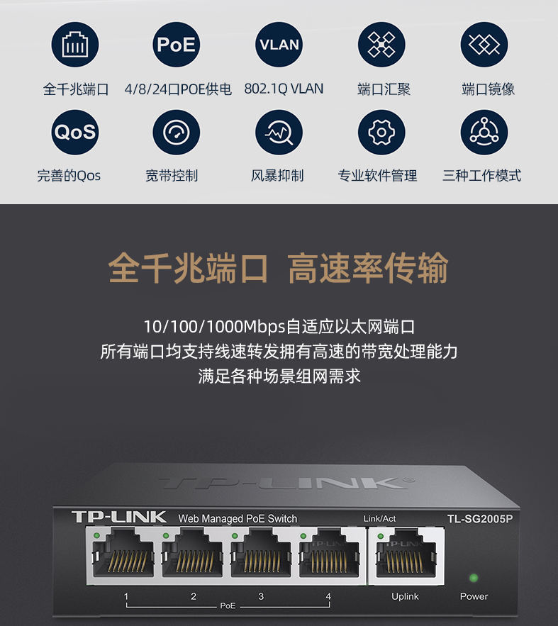 以太網(wǎng)交換機(jī)普聯(lián)/TP-LINK全千兆Web網(wǎng)管PoE以太網(wǎng)云管理交換機(jī)5口千兆TL-SG2005P/臺(tái)