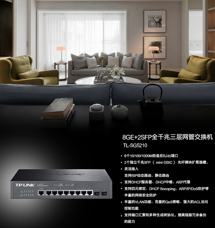 以太網(wǎng)交換機(jī)普聯(lián)/TP-LINK8口全千兆三層交換機(jī)帶2光纖光口可網(wǎng)管VLAN網(wǎng)絡(luò)企業(yè)級(jí)TL-SG5210/臺(tái)