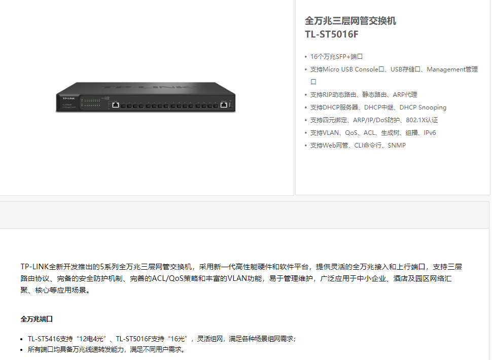 以太網(wǎng)交換機(jī)普聯(lián)/TP-LINK企業(yè)級商用核心交換機(jī) 支持VLAN16口萬兆光口TL-ST5016F/臺